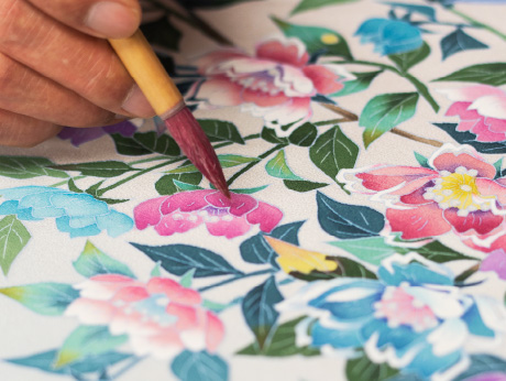 - ※ 加賀友禅は本来手作業で全ての工程を行います。このパーティションは機能性を重視して、加賀友禅のデザインをアクリルに特殊プリントを用いて表現したものです。