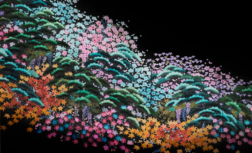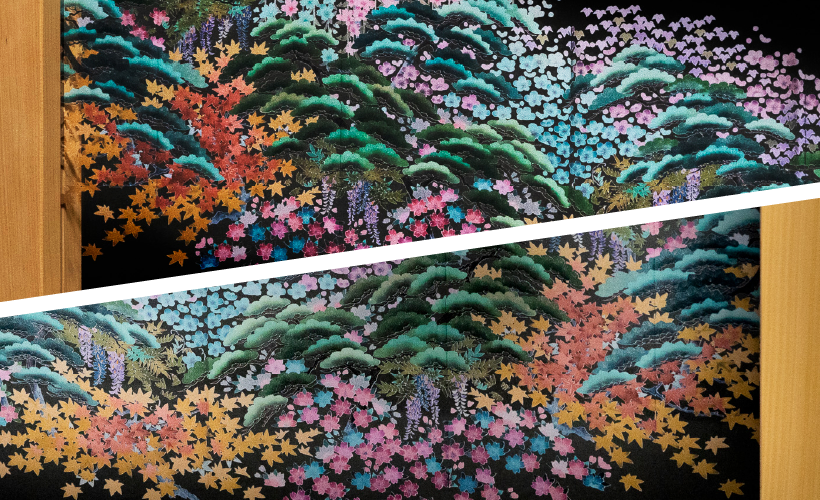 松梅紅葉桜藤など四季の草花を繊細なボカシを用いて描きました。加賀友禅らしい華やかな和の空間を演出します。